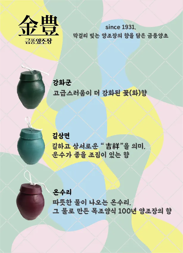 전통적인 모습의 캔들과 파스텔컬러톤의 조합으로 디자인된 엽서에서 금풍양조의 새로운 변화를 느낄수 있습니다.