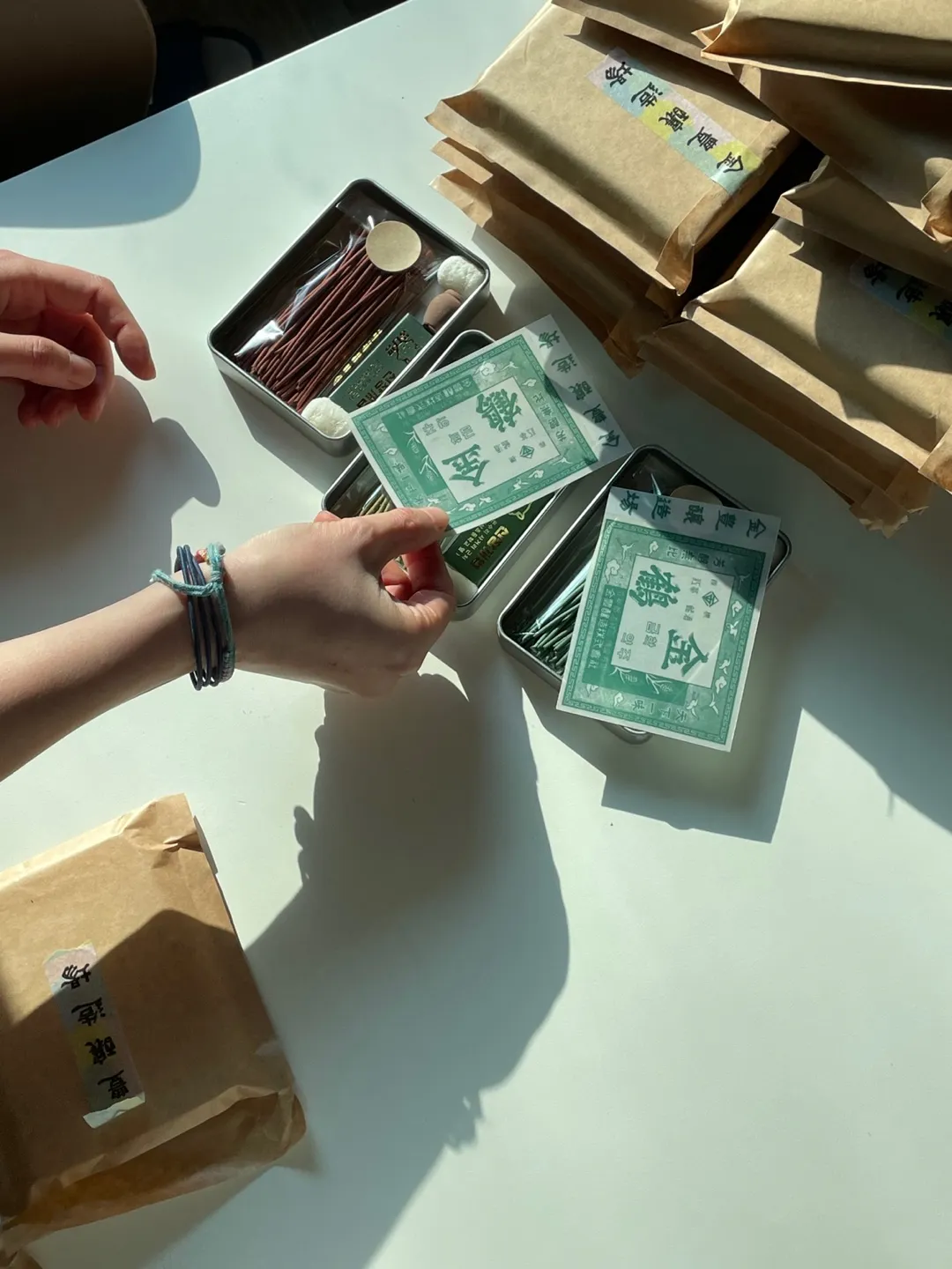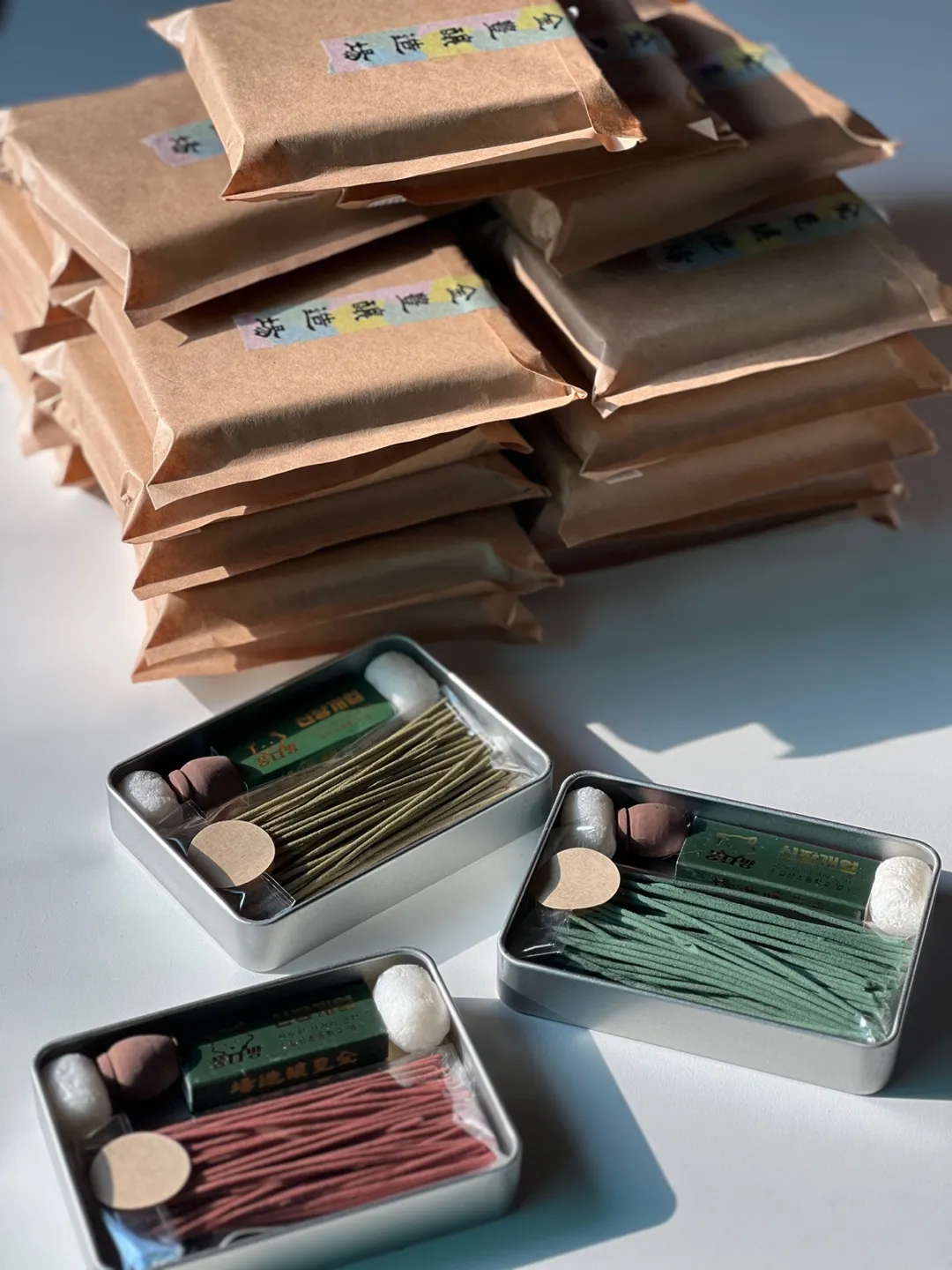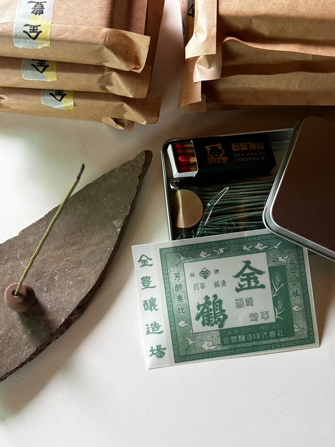 막걸리 지게미가 소량 들어간 100% 핸드메이드 선향 인센스 입니다. 금학약주 라벨을 그대로 재현한 커버와 금풍이성냥, 술항아리 미니어쳐 인센스 홀더를 휴대하기 좋은 틴케이스에 담았습니다. 약간은 구불구불하고 길이가 일정하지 않을 수 있지만 직접 막걸리를 빚어내는 금풍양조장의 마음처럼 하나하나 직접 제작하였습니다.